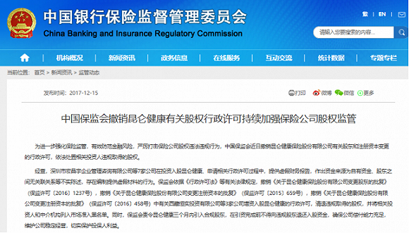 2017年12月官方公布的信息显示,为进一步强化保险监管,有效防范金融风险,严厉打击保险公司股权违法违规行为,原中国保监会当时撤销昆仑健康保险股份有限公司有关股东和注册资本变更的行政许可,依法处置相关投资人违规取得的股权。