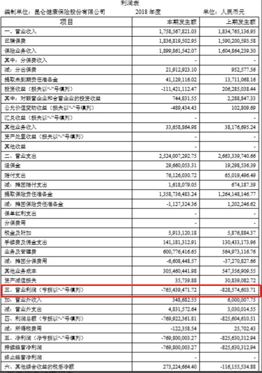 据昆仑健康2018 年年度信息披露报告显示,2017年,昆仑健康营业利润亏损达到8.29亿元。2018年,营业利润亏损额度也达到了7.65亿元。