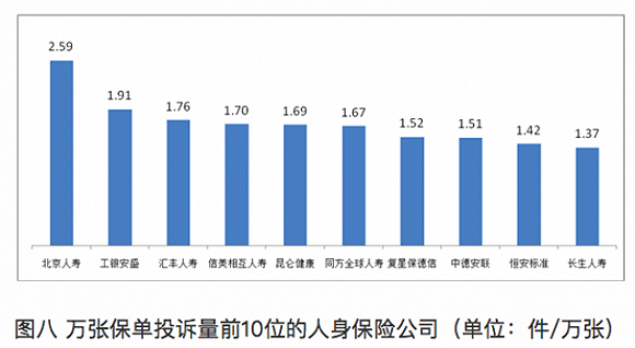 该份通报还显示,万张保单投诉量排第一的是北京人寿2.59件/万张,第十位的是长生人寿1.37件/万张。