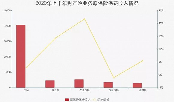 在财产险业务中,车险保费收入4082亿元,同比增长2.92%;责任险保费收入479亿元,同比增长14.32%;农业保险保费收入543亿元,同比增长21.75%;保证保险保费收入369亿元,同比下降1.07%;企财险保费收入307亿元,同比增长5.50%。