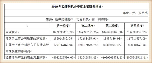 财报显示,2019年,经纬纺机实现营业总收入93.35亿元,上年同期101.96亿元,同比下降8.44%。其中,营业收入46.87亿元,上年同期60.43亿元,同比减少13.56亿元(纺机业务营业收入41.63亿元,同比减少3.34亿元;金融业务营业收入5.24亿元,同比减少10.22亿元)。公司实现归属于母公司净利润4.90亿元,同比减少2.67亿元。经营现金流量净额0.16亿元,同比减少47.76亿元。
