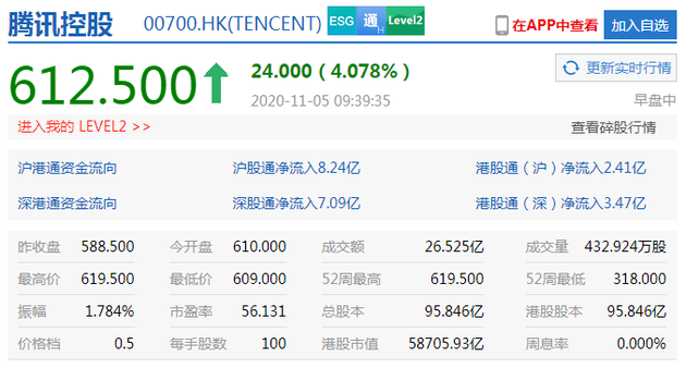 新浪科技讯 11月5日上午消息,腾讯控股盘中一度涨超5%,港股市值6万亿港元。截至发稿,腾讯控股涨4.07%报612.50港元,市值58705.93亿港元。