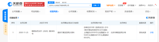 新浪科技讯 12月14日上午消息,天眼查App显示,近日,网红燕窝品牌“小仙炖”关联公司北京市小仙炖电子商务有限公司被北京市朝阳区统计局行政处罚,处罚事由/违法行为类型为提供不真实的统计资料,处罚结果/内容为:你单位2019年《财务状况》(E103表)中营业利润本年(3231)指标上报数为32939千元,检查数为-32934千元,相差65873千元,差错率200.02%。