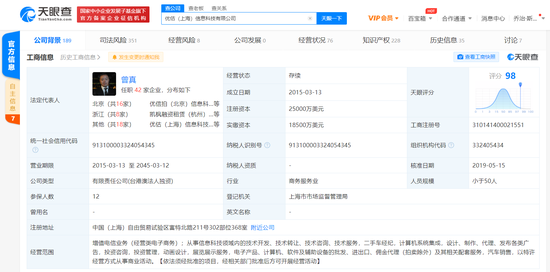 天眼查App显示,优估(上海)信息科技有限公司成立于2015年3月,法定代表人为曾真,注册资本25000万美元,经营范围包括二手车经纪、计算机系统集成、汽车销售、投资咨询等。据华夏时报报道,该公司为优信二手车关联公司。