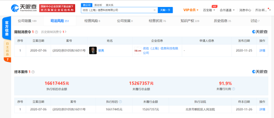 新浪科技讯 12月18日下午消息,天眼查App显示,近日,优估(上海)信息科技有限公司新增一条限制消费令,案号为(2020)京0105执16011号,相关人员为该公司法定代表人曾真,立案日期在2020年7月,公布日期在2020年11月。相关案件执行标的总金额16617445元,未履行总金额15267357元,目前已成为终本案件。