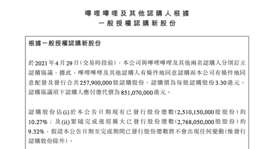 新浪科技讯 4月29日早间消息,中手游港交所公告称,4月29日,本公司与哔哩哔哩及其他两名认购人分别订立认购协议,据此,哔哩哔哩及其他认购人有条件地同意认购而本公司有条件地同 意配发及发行合共2.579亿股认购股份,占扩大后股份总数约9.32%,认购价为每股认购股份3.30港元。认购协议项下认购人应付总代价为8.51亿港元。本次配售完成后,哔哩哔哩将持有公司7.15%的股份。