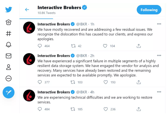 当地时间周一凌晨,盈透证券交易平台出现了技术故障,导致100多万交易者无法登录账户。 讽刺的是,就在上周五下午,盈透证券在其社媒账户上吹嘘:我们荣获了2020年最佳交易技[详细]