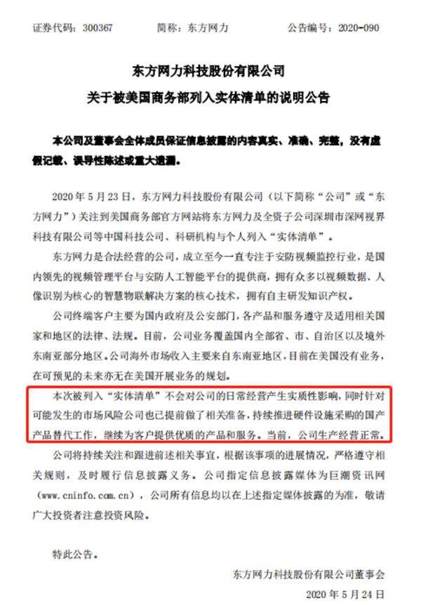 在被列入实体清单后,东方网力也快速作出了回应。5月24日晚间,东方网力披露一则公告显示,公司关注到美国商务部官方网站将东方网力及全资子公司深圳市深网视界科技有限公司等中国科技公司、科研机构与个人列入“实体清单”。