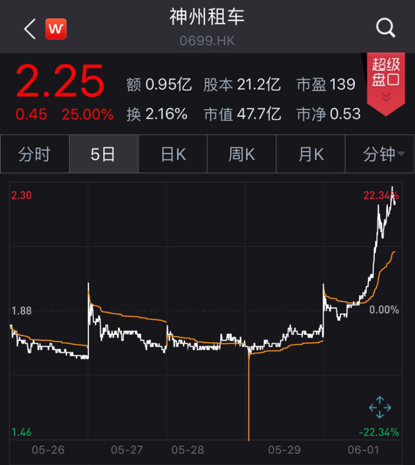 受该消息提振,神州租车盘前竞价一度涨近11%,今日股价高开7.78%,随后虽涨幅有所收窄,但午后再度走高,最高点至2.27港元/股,最高涨幅达27.8%,市值急增近10亿港元。