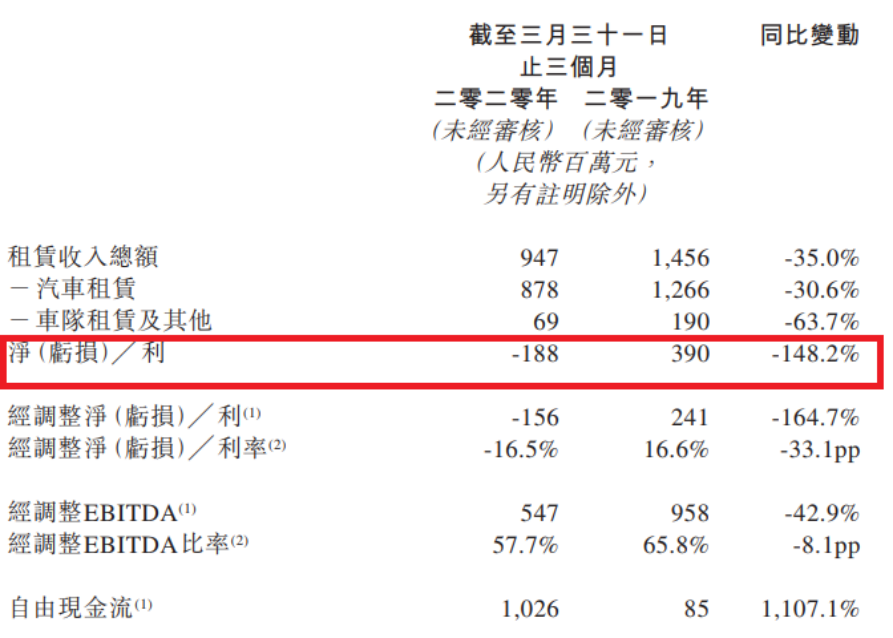 5月31日,神州租车发布2020年一季报,一季度神州租车实现总收入13.25亿元人民币,去年同期18.50亿元,同比减少28.3%。净利更是由盈转亏,净亏损1.88亿元,较去年同期的盈利3.90亿元暴跌148.2%。