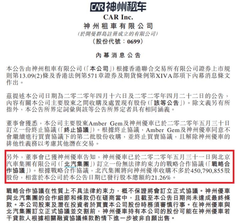 今日早间,神州租车有限公司在港交所公告,称董事会已获大股东神州优车告知,神州优车已于2020年5月31日与北京汽车集团有限公司订立一份无法律约束力的战略合作协议。