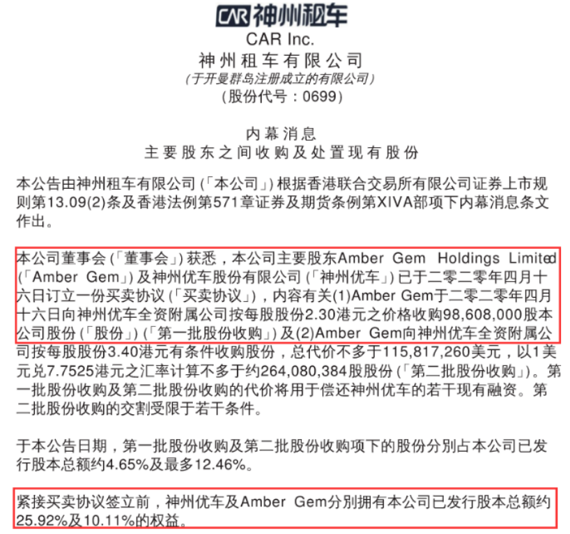此前4月16日,神州租车公司曾发布公告称,公司第四大股东Amber Gem Holdings Limited(华平投资的子公司)与神州优车已签订了买卖协议,Amber Gem将分两批收购神州优车所持有的神州租车近4亿股股份。
