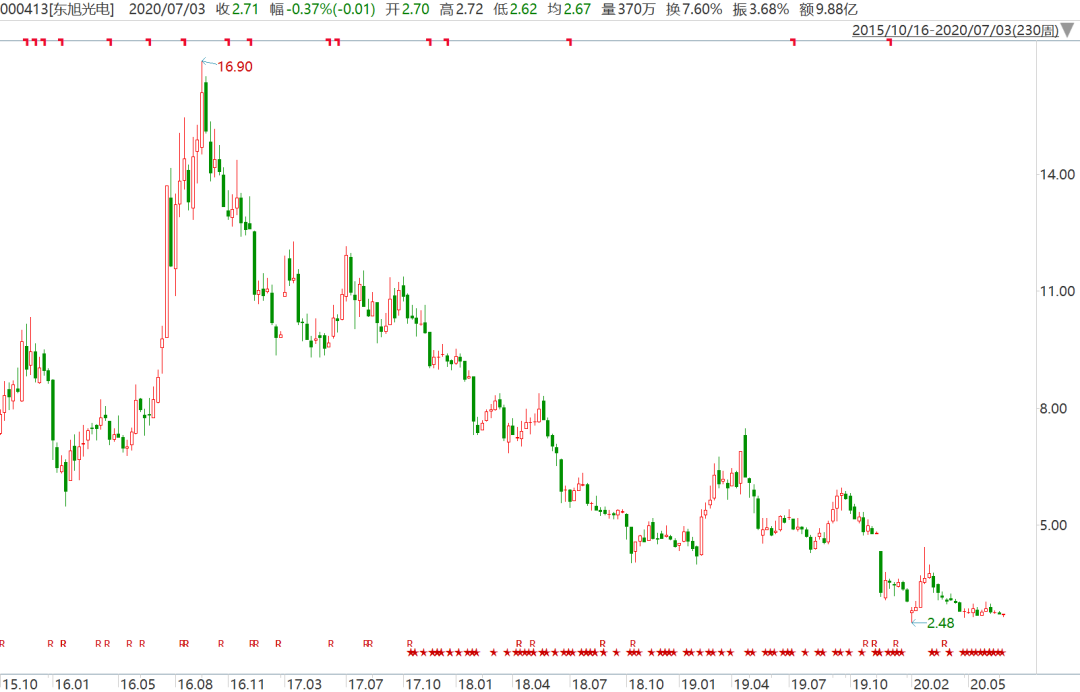 爆雷之后的东旭光电,亦是连续崩塌。截止目前,其股价仅剩2.71元/股,较2016年的最高点(16.9元)跌去83.9%,总市值更是蒸发超过813亿元。