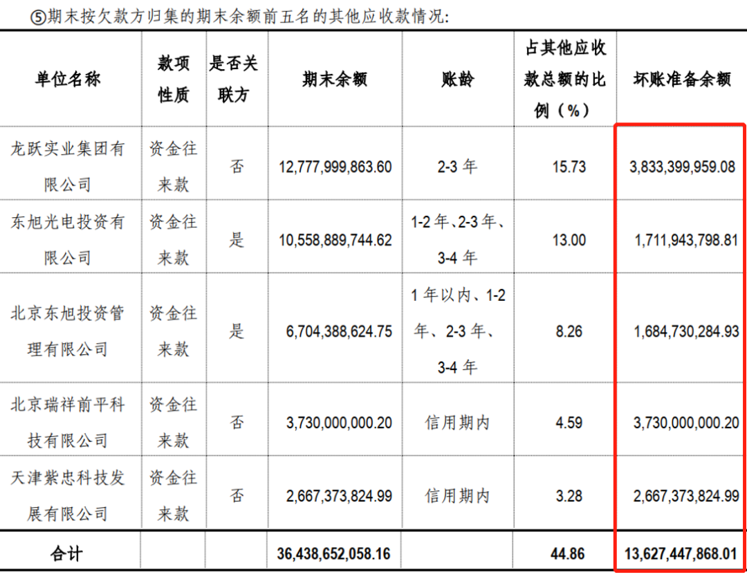 更魔幻的操作来了,东旭集团将货币资金转移到“其他应收款”之后,直接大额计提坏账准备。据财报显示,应收款余额前5名合计计提了136.3亿元的坏账,坏账比例达37.4%。