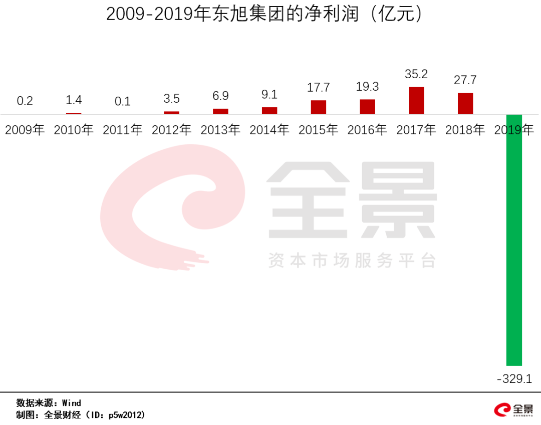 据财报数据显示,2019年,东旭集团的营业收入超340亿元,同比降幅33.26%;净利润为-329.1亿元,而2018年同期的盈利规模达12.14亿元。