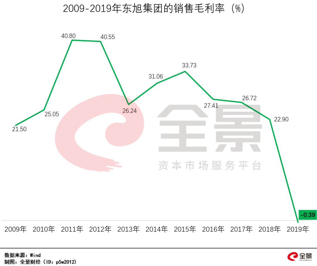 2、营收下滑的同时,东旭集团的主营业务突然不赚钱了,其整体毛利率由22.9%突然大幅降至-0.39%;