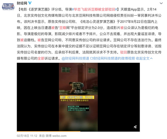 2月14日,天眼查披露了北京实传创文化传媒有限公司(毕志飞)与北京豆网科技有限公司网络(豆瓣)侵权责任纠纷一审民事判决书,判决结果显示,豆瓣胜诉。2月18日,话题“毕志飞起诉豆瓣被全部驳回”随即登上微博热搜。