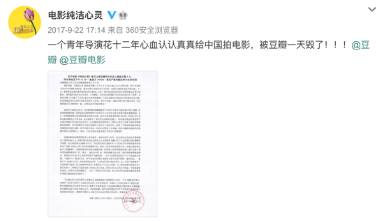 首映当天下午,毕志飞通过电影官方微博@电影纯洁心灵,首次与豆瓣正面交涉,控诉其侵犯了自己的名誉权。他在微博写下“一个青年导演花十二年心血认认真真给中国拍电影,被豆瓣一天毁了”,并以三个惊叹号结尾表达自己的愤怒。