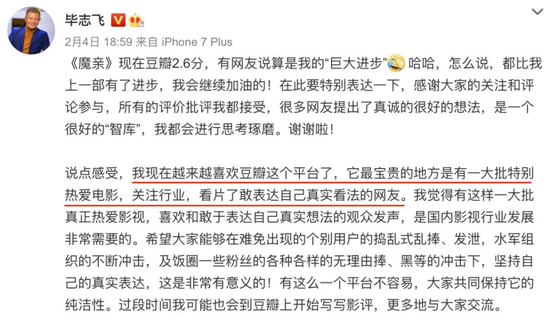 近期,毕志飞还上线了自己的新动画短片《魔亲》。在判决书被公开披露前夕,他在谈及《魔亲》时,坦然接受网友对豆瓣2.6分短片“巨大进步”的评价。也正面表达了自己“越来越喜欢豆瓣”,认为豆瓣上有一批“真正热爱影视,喜欢和敢于表达自己真实想法的观众”。