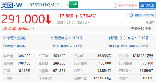 恒生科技指数持续下挫 美团跌近6%小米集团跌近7%
