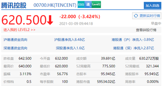 腾讯控股跌3.42% 市值跌破60000亿港元