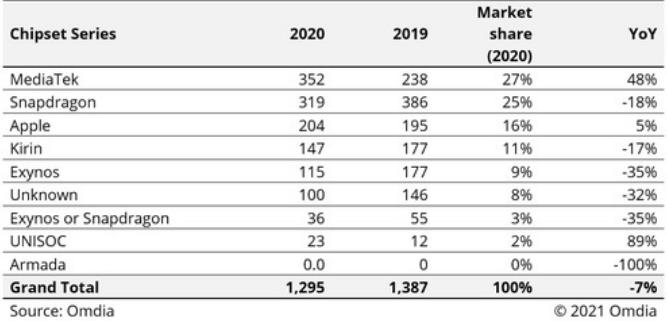日前,知名调研公司Omdia发布2020年智能手机芯片市场数据。数据显示,联发科凭借27%的份额占比成功超越高通,成为2020年手机芯片出货数最多的企业。这也是联发科首次在全年销量上反超,于联发科而言,这算是打了一针强心剂。