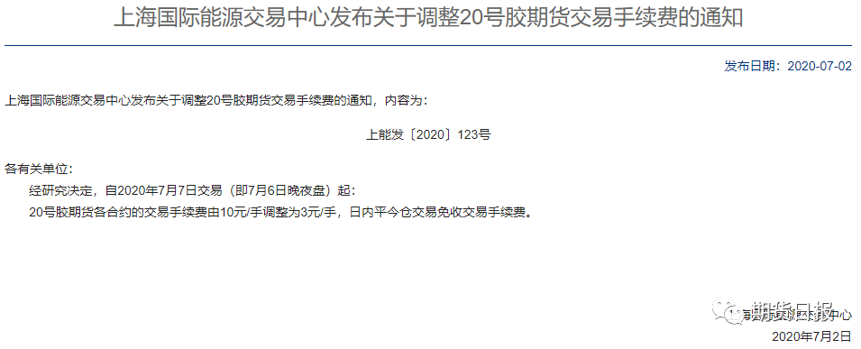 7月2日,上期所及其子公司上海国际能源交易中心(简称上期能源)发布公告,下调不锈钢、天然橡胶(10410, 100.00, 0.97%)和20号胶期货交易手续费。自2020年7月7日交易(即7月6日晚夜盘)时起,不锈钢期货各合约交易手续费由目前的万分之一调整为2元/手,天然橡胶期货交易手续费由目前的万分之零点四五调整为3元/手,20号胶期货交易手续费由10元/手调整为3元/手。下调后,上述3个品种的交易手续费均约合万分之零点三三,日内平今仓均暂免收交易手续费。