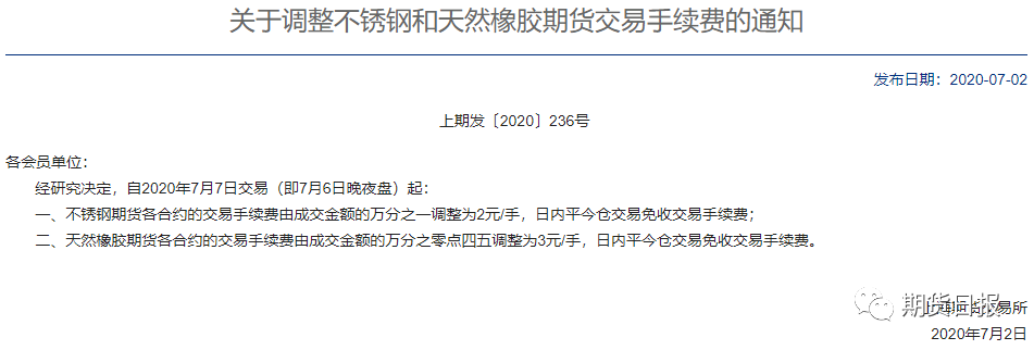 7月2日,上期所及其子公司上海国际能源交易中心(简称上期能源)发布公告,下调不锈钢、天然橡胶(10410, 100.00, 0.97%)和20号胶期货交易手续费。自2020年7月7日交易(即7月6日晚[详细]