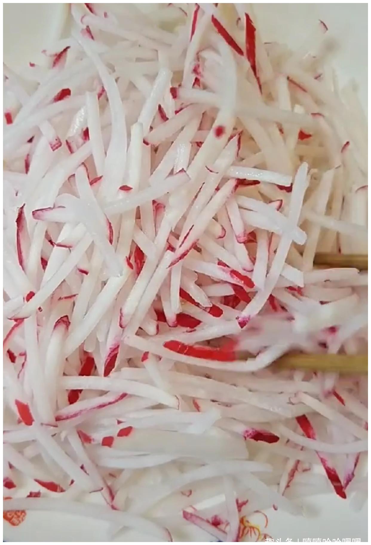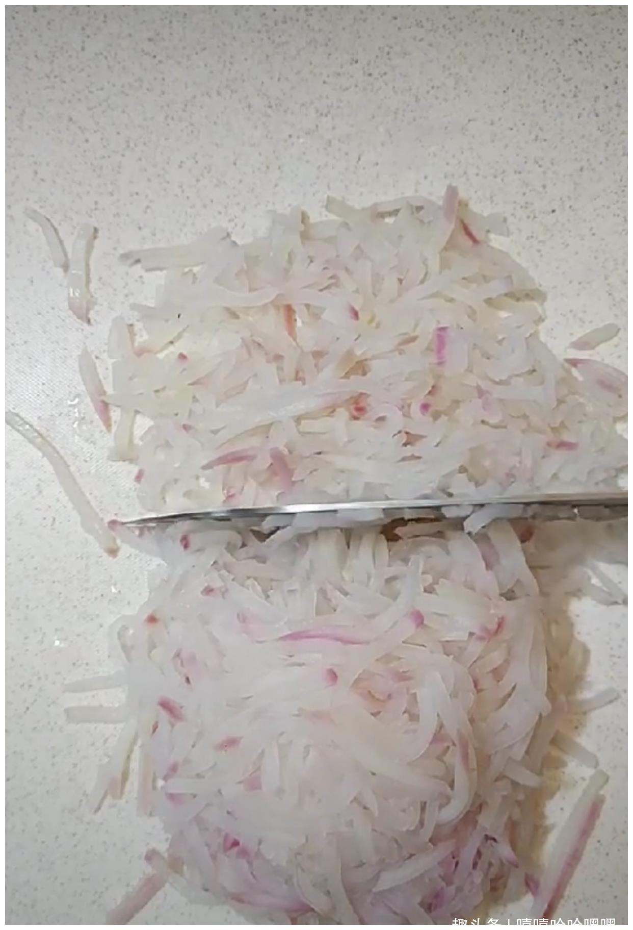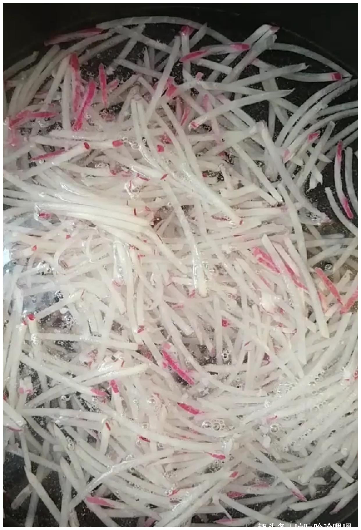 1、萝卜切成丝,锅中水开放入锅中煮一分钟捞出。