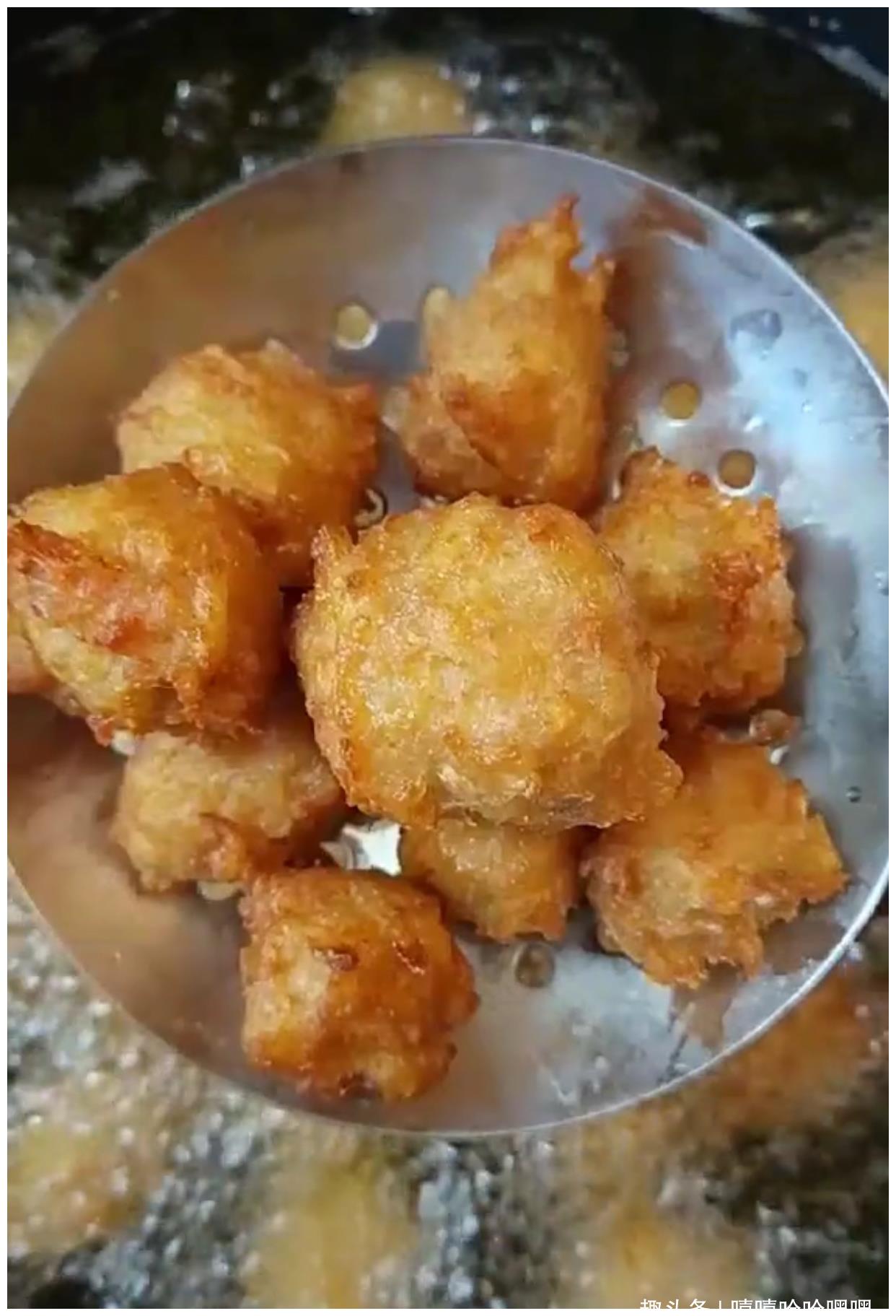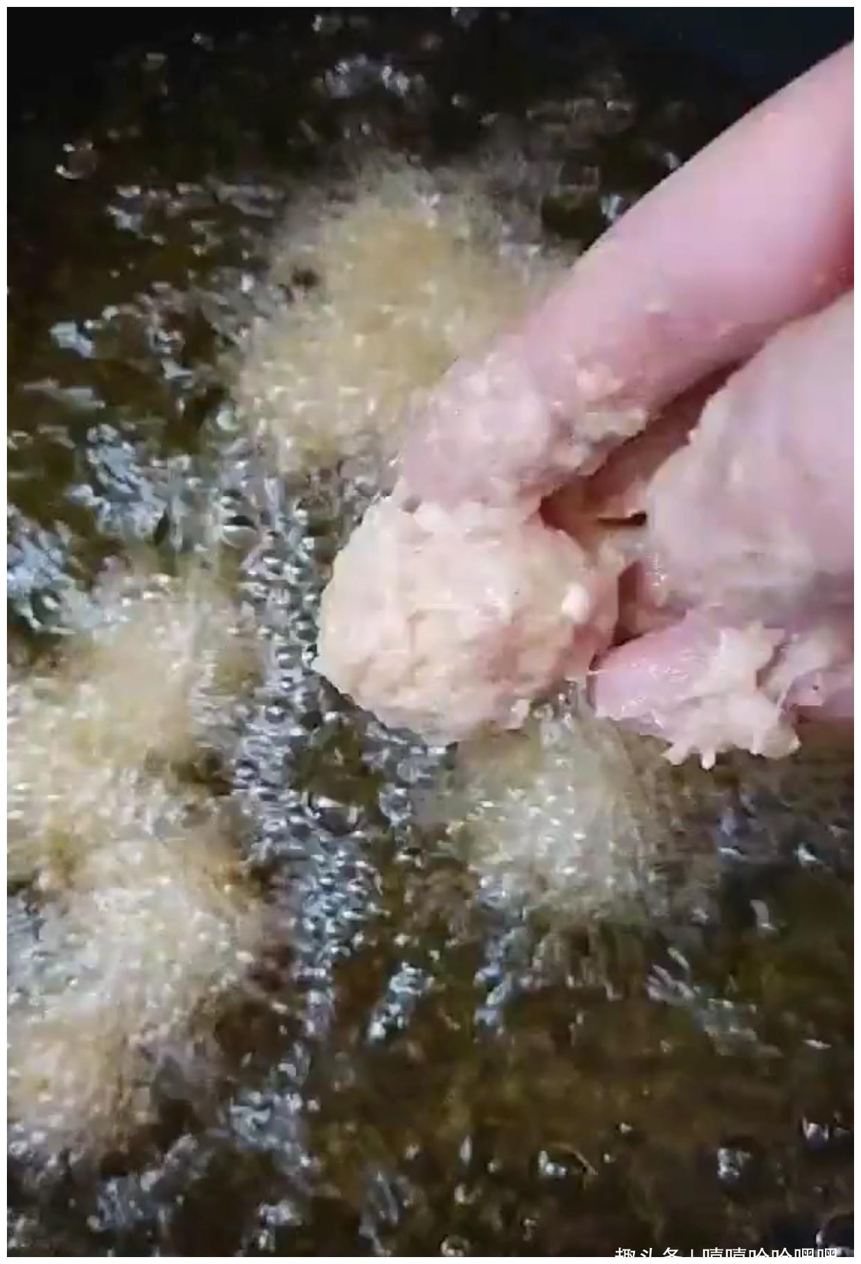 4、油温四五成热,挤成丸子下锅炸,小火慢炸炸至金黄酥脆捞出。