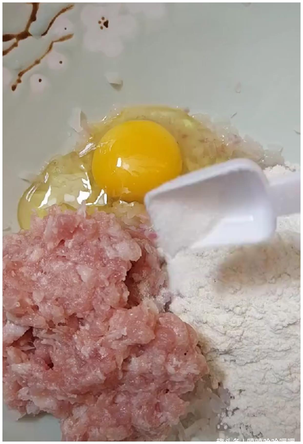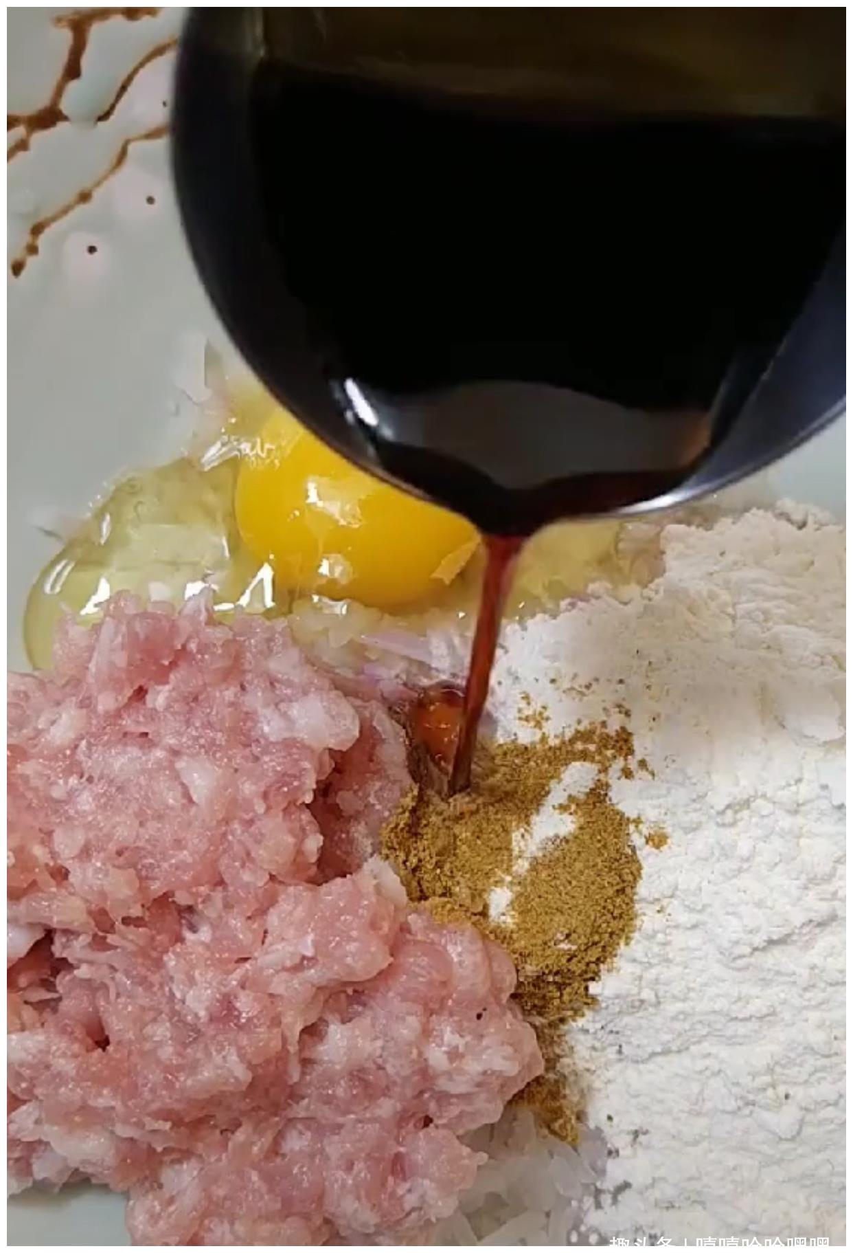 3、打入一个鸡蛋加入肉末,放入面粉,然后加入一勺盐、十三香粉,最后放入生抽搅拌均匀。