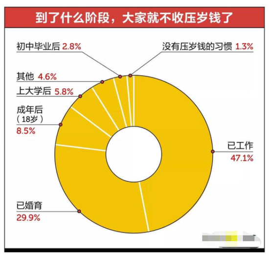 对于大部分中国家庭来说,拿压岁钱也是有门槛的。“已经工作”代表孩子已经有了自己的收入,将近一半的受访者在工作之后便不再收压岁钱。有些家庭则是以结婚为时间点,只要单身就一直有压岁钱拿。从年龄上看,30岁为收发压岁钱的门槛,在调查中,年龄在30到40岁的人,不收但要给压岁钱的比例为61.6%,而25到30岁的人中,这一比例仅为25.5%。