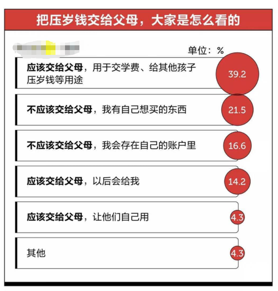 在很多孩子眼里,压岁钱交给父母以后,用途一直是个谜。在调查中,38.8%的父母不会和孩子商量压岁钱怎么用,但也有一些父母尊重孩子的想法,会和孩子沟通这笔钱的使用计划。还有16.7%的父母直接让孩子自己做主。