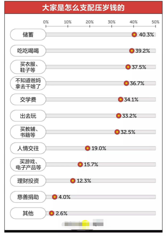那么,这些压岁钱都是怎么使用的呢?40.3%的受访者表示把钱存了起来,其他常见的用途还包括吃吃喝喝、购买衣服和鞋子等,但也有36.7%的受访者一脸懵逼地表示“不知道爸妈拿去干啥了”。有趣的是,选择把压岁钱用在买教辅、书籍的人,是选择买游戏、电子产品的人的两倍,为了学习,大家还是很拼的。