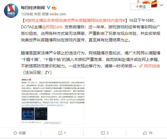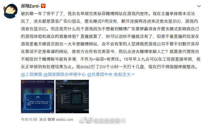 16日下午16时,DOTA2主播@郑翔Zard- 发表微博称:近一年来,游玩游戏时经常有博彩网站广告ID狙击,动用各种方式皆无法屏蔽,严重影响了玩家与观众体验,并实名举报完美世界纵容赌博网站在游戏内宣传,直至其有处理结果为止。
