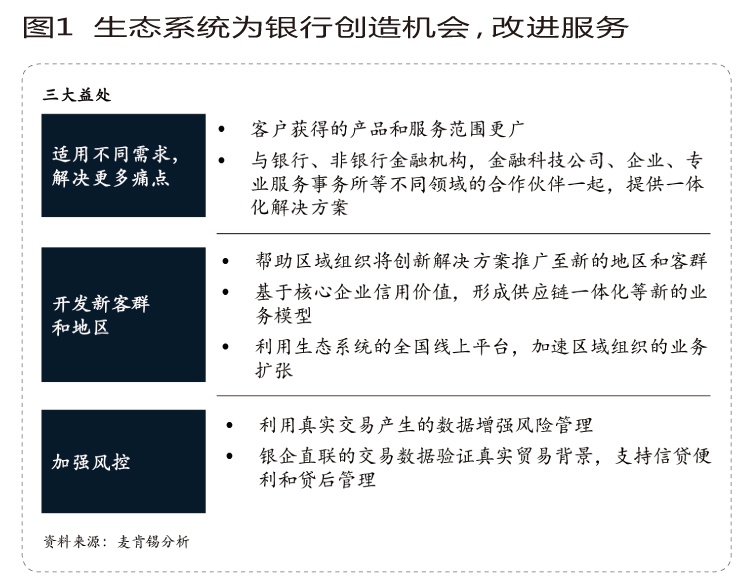 对客户和供应商来说,生态系统的潜在优越性显而易见,因此生态系统在公司银行领域的发展前景可谓方兴未艾,值得期待。