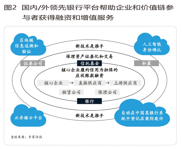 中国某领先保险公司的银行业务分支正在利用多种技术(区块链、AI、云计算)扩展以零售为主的生态系统,搭建一个供应链应收账款平台(见图2)。该银行表示,由此形成的互通网络有利于资产证券化和交易机会,融资可以贯穿整条供应链,触及次级供应商,甚至可能延伸更广。