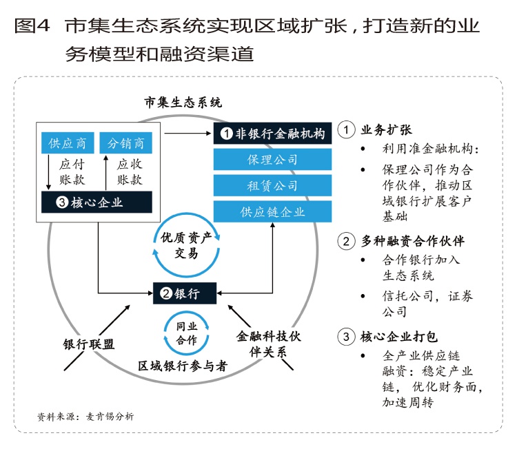 市集模型促成银行与其他领域对象合作,发展新型的伙伴关系,实现扩张(见图4)。某家地方银行与其他银行、非银行金融机构、保理公司、核心企业共同建设的平台,使该地区内外的参与者都能享受到贸易融资、资产交易、支付,以及增值服务。该银行受益于与保理公司的合作,以及与其他金融机构的联盟。根据设计,平台上的这些关系是互利的:银行获得优质信贷资产,保理公司找到新的业务,而企业则有了更多的融资选择。