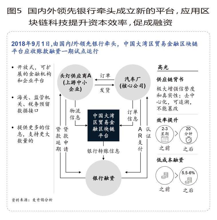 国内某大型银行,某英国领先银行,某大型汽车公司,和国内某领先保险企业,一起打造了中国粤港澳大湾区贸易金融区块链平台(见图5),其利益相关者包括两家中国四大银行,以及国内某领先银行。该项目旨在帮助参与者及中小企业获得融资和物流、海关、税务咨询等多种服务,并拟将实现更低利率和更快贷款审批 — — 与之前的数周相比,仅需20分钟 。订单、物流、交易数据存储在区块链账本中,这一账本在2018年9月推出并进行了测试。该平台也会与物联网相通,实现合同自动履行。