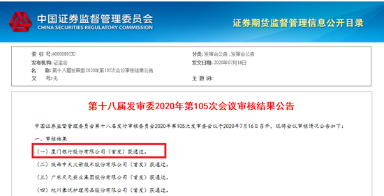 7月16日,中国证监会发行审核委员会召开年内第105次发审会,厦门银行股份有限公司(首发)获通过。这意味着,厦门银行或成为2020年首家登陆A股的银行。 中国证监会官网截图。[详细]